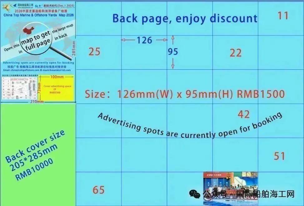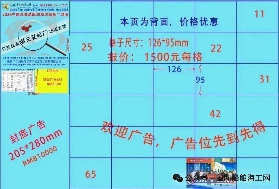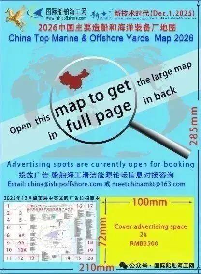 同时,为迎接2年一届的中国国际海事展览会将于2025年12月2-5日在上海举办,一些参展单位已开始准备在国际船舶海工网将在该展会上继续免费赠送的中文和英文版的2026年版中国造船地图上投放广告,又将掀起新一轮看图热,以往在中外被纷纷好评有图有真相,1千5百元人民币就可在上面刊登一次广告。6月底前付款中文和英文同时投放,还将免费获赠一次中文或者英文广告机会(今年6月11日将发布中文版地图,2026年3月和9月将继续分别发布英文地图)。