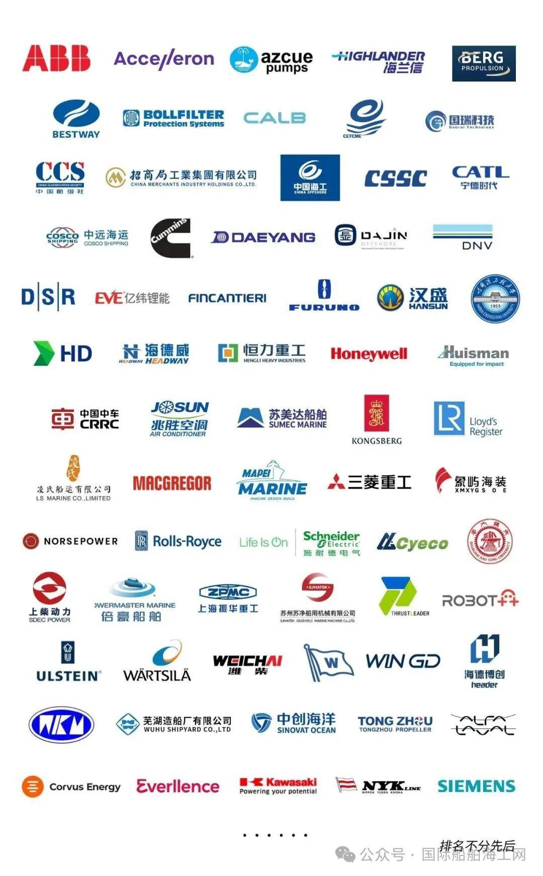 Dassault Systèmes、西门子 Siemens、霍尼韦尔 Honeywell、挪世航力 Norsepower、罗罗 Rolls-Royce、施耐德电气 Schneider Electric、瓦锡兰 Wärtsilä、WinGD、帕纳希亚 Panasia、波勒 BOLLFILTER、利勃海尔 Liebherr,采埃孚 ZF Friedrichshafen,古野电气 Furuno Electric、凡泽特 Vanzetti、修弗斯润亩 Silverstream、中控海洋 AquaSync Innovation、进联 Switchlab、特瑞堡航运与基建 Trelleborg Marine & Infrastructure,以及劳氏船级社LR、法国船级社BV、韩国船级社KR等国际船级社。