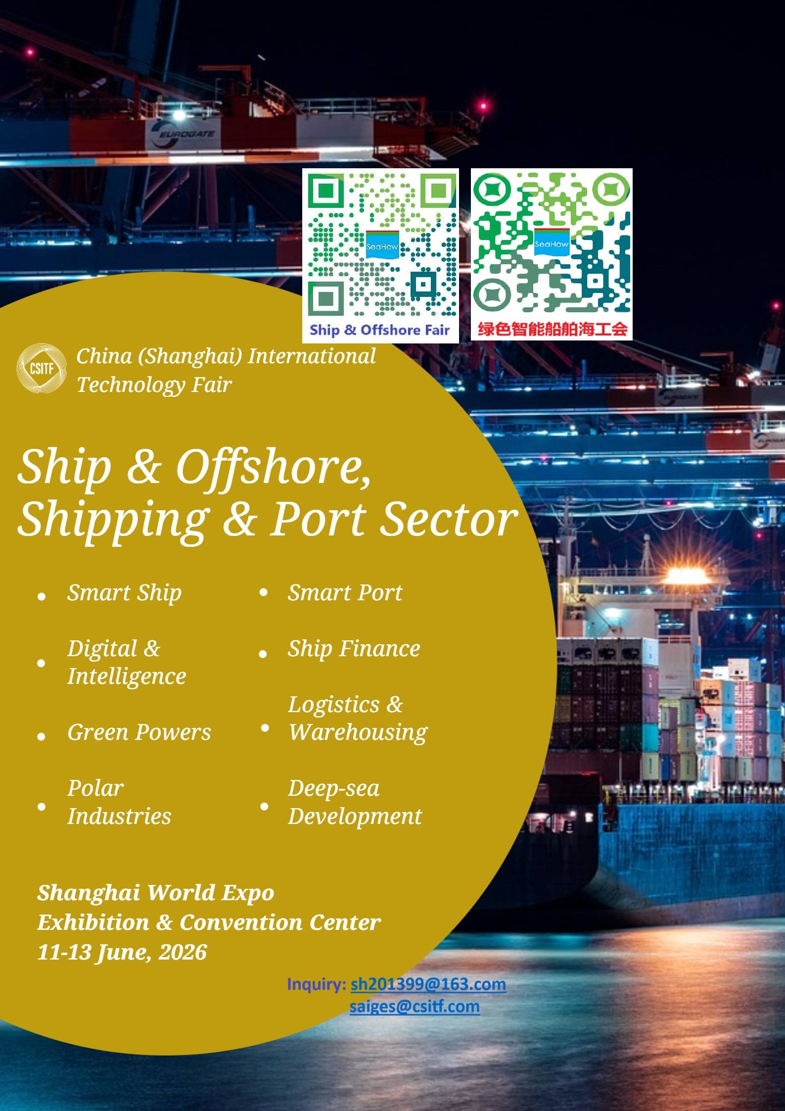 The 12th China (Shanghai) International Technology Fair (in short as “CSITF”) will be held on June 11-13, 2026 at the Shanghai World Expo Exhibition and Convention Center. This year’s CSITF will set up two industry specific exhibition areas for Shipbuilding & Offshore Engineering , and Shipping & Ports, so as to create a professional sector with industry influence.