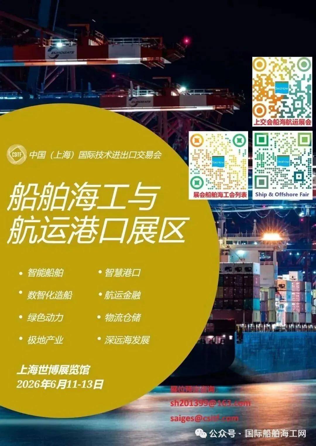 、船舶海工与航运港口、科技金融等主题展览展区以及系列论坛会议,持续打造具有行业影响力的专业板块。同时国际船舶海工网和低空天地平台将在上交会支持下,同期配套召开2026年机器人与人工智能上海国际论坛。咨询报名:china@ishipoffshore.com 或 chinabobli@126.com