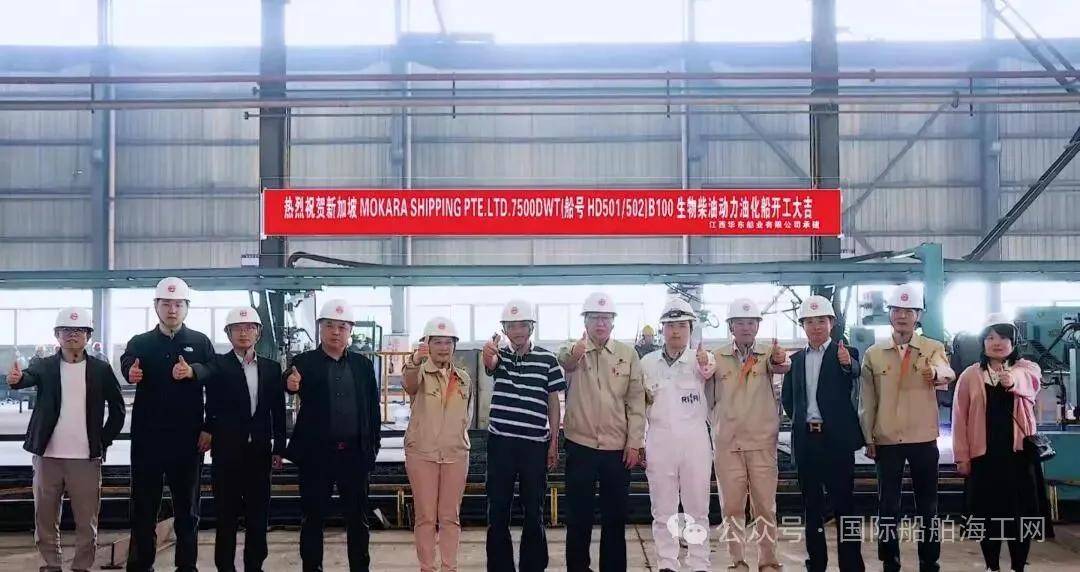 在新加坡MOKARA SHIPPING公司、RINA船级社、船舶设计公司等单位代表及华东船业领导员工的共同见证下,2艘7500DWT油化船的开工仪式圆满举行。这两艘船将采用B100生物柴油燃料作为动力,这一创新举措对于推动 绿色航运的发展具有重要意义。