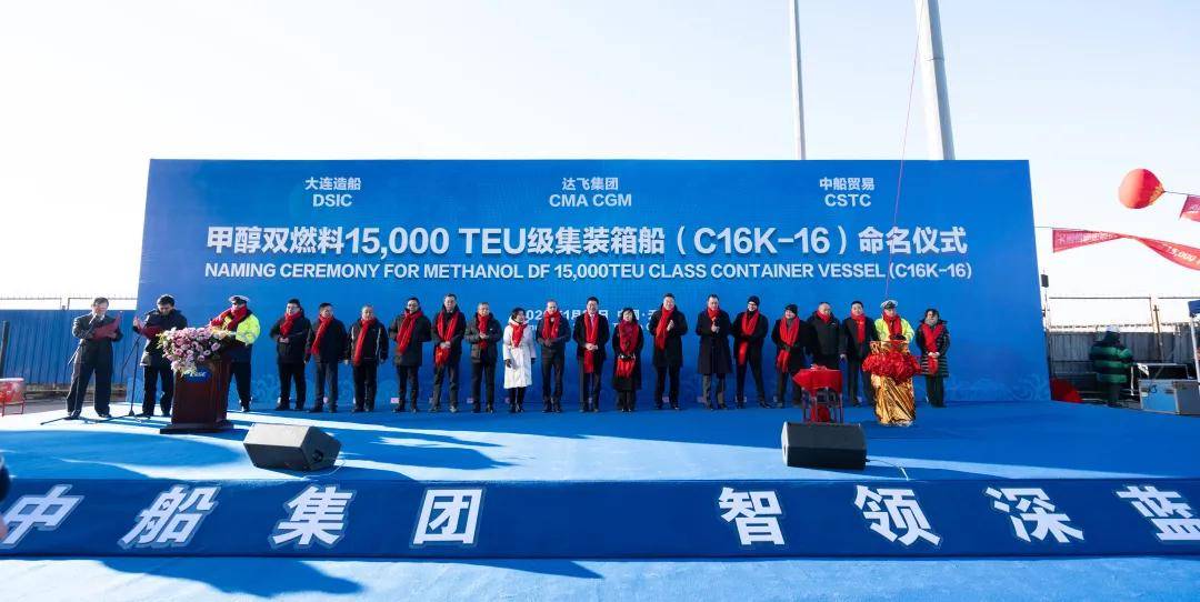 1月21日,中船大连造船大船天津联合中船贸易为法国达飞海运集团建造的华北地区首艘甲醇双燃料15000TEU集装箱船命名交付。